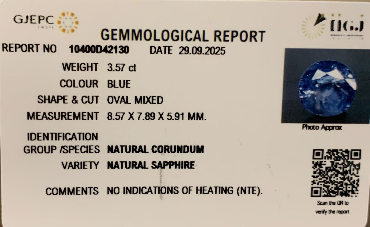 100% Natural, Non-Treated, Sri-Lankan Blue Sapphire for potentiating the positive energies of planet Shani (Saturn) in one’s life, Astrologically Approved (Jyotish- Standard), No- Negative inclusions (According to the Ancient Gems healing Vedic Texts), Purified and energized with Vedic Shani (Saturn) Mantras (To purify and magnify the planetary Energies), Certified by Govt. Lab.