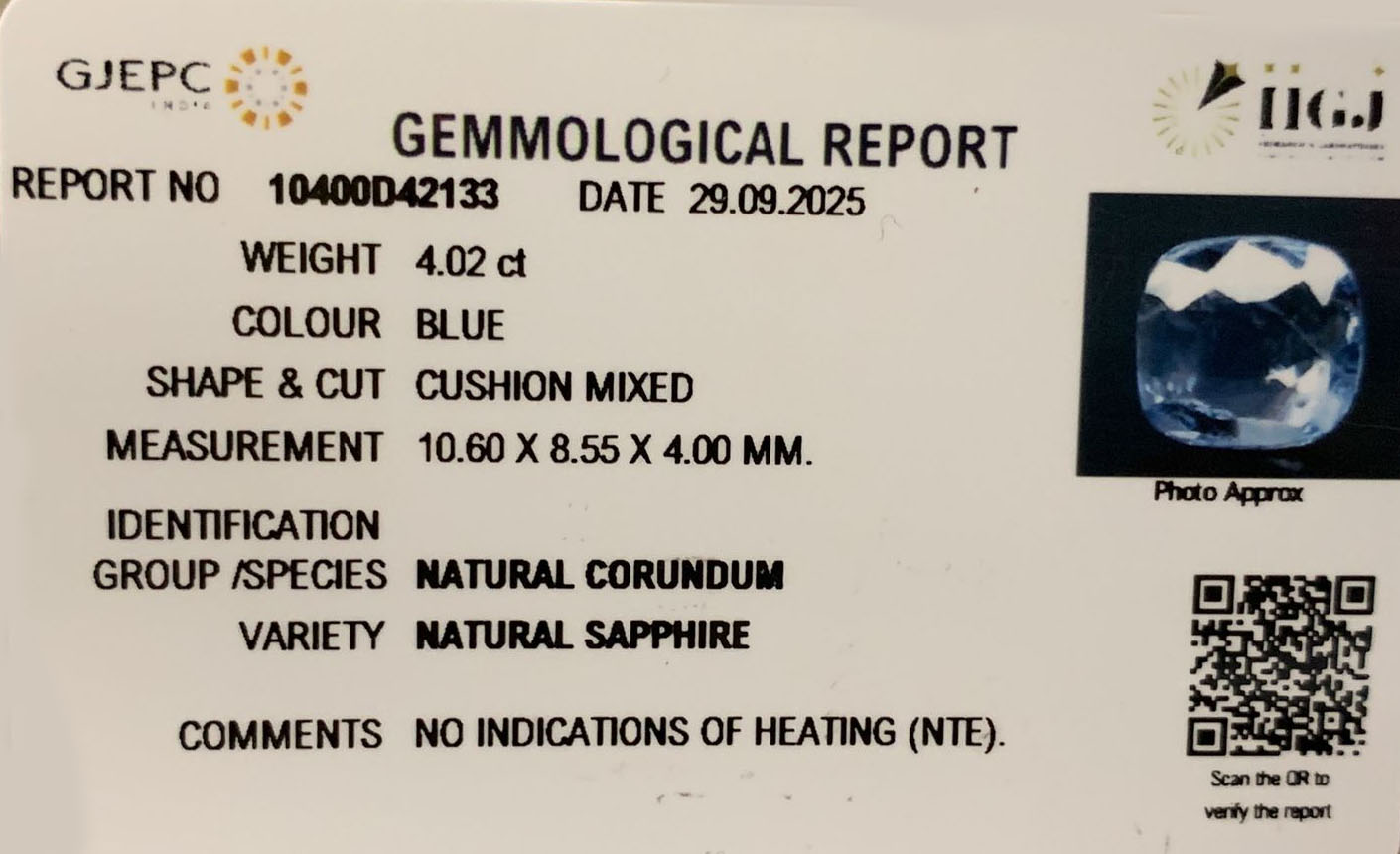 100% Natural, Non-Treated, Sri-Lankan Blue Sapphire for potentiating the positive energies of planet Shani (Saturn) in one’s life, Astrologically Approved (Jyotish- Standard), No- Negative inclusions (According to the Ancient  Gems healing  Vedic Texts), Purified and energized with Vedic  Shani (Saturn) Mantras (To purify  and magnify the planetary Energies), Certified by Govt. Lab.