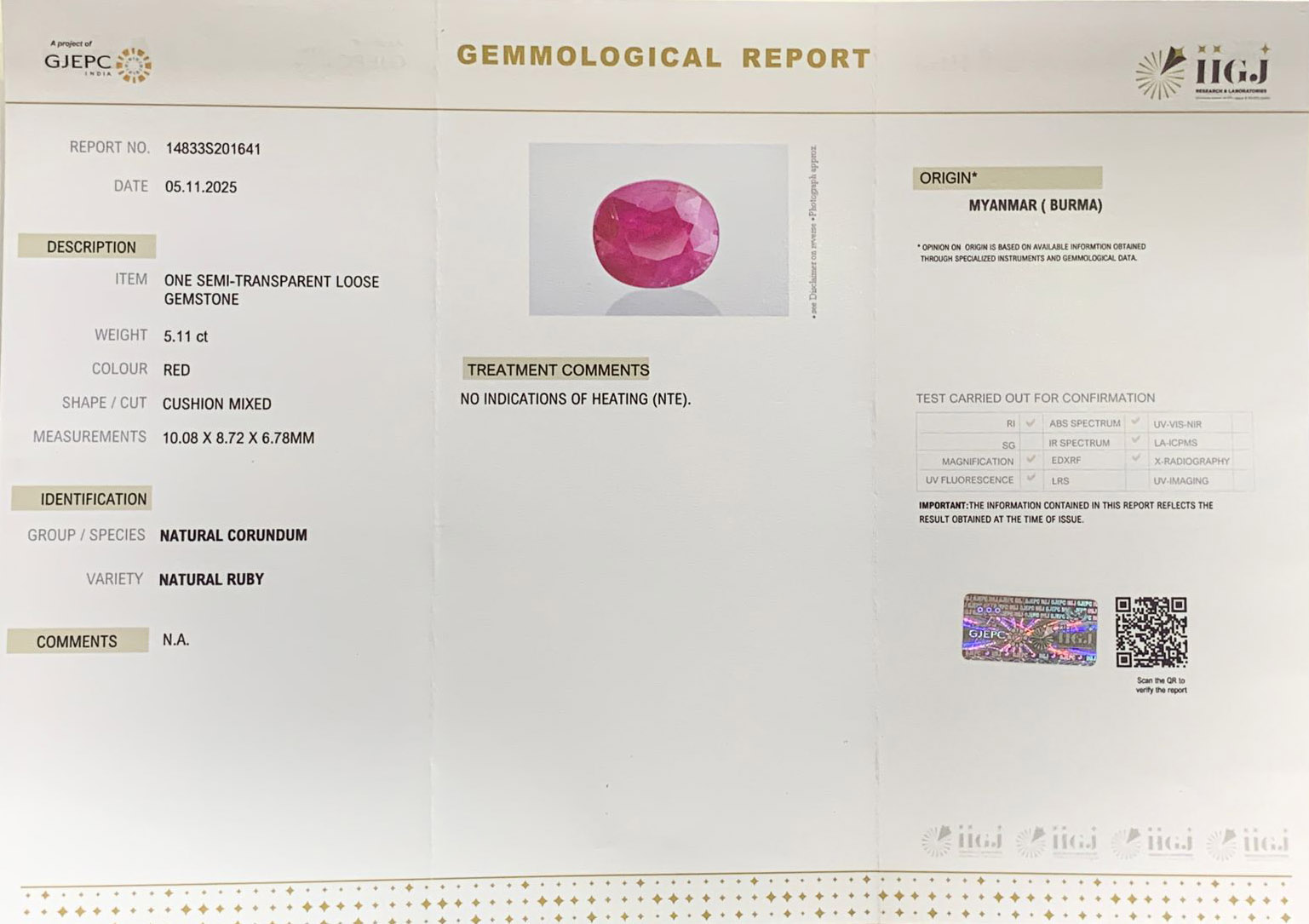 Absolutely Pure & Natural, Non-Treated (No Heat & Treat), Fine Quality (Very Good Transparency, color and Brilliance) Burmese Ruby for potentiating the positive energies of planet Surya (Sun) in one’s life, Astrologically Approved (Jyotish-Standard), No-Negative inclusions (According to the Ancient Gems healing Vedic Texts), Purified and Energized with Vedic Surya (Sun) Mantras (To purify and magnify the planetary Energies), Certified by International Standard – GII (Gemological Institute of India) Lab.