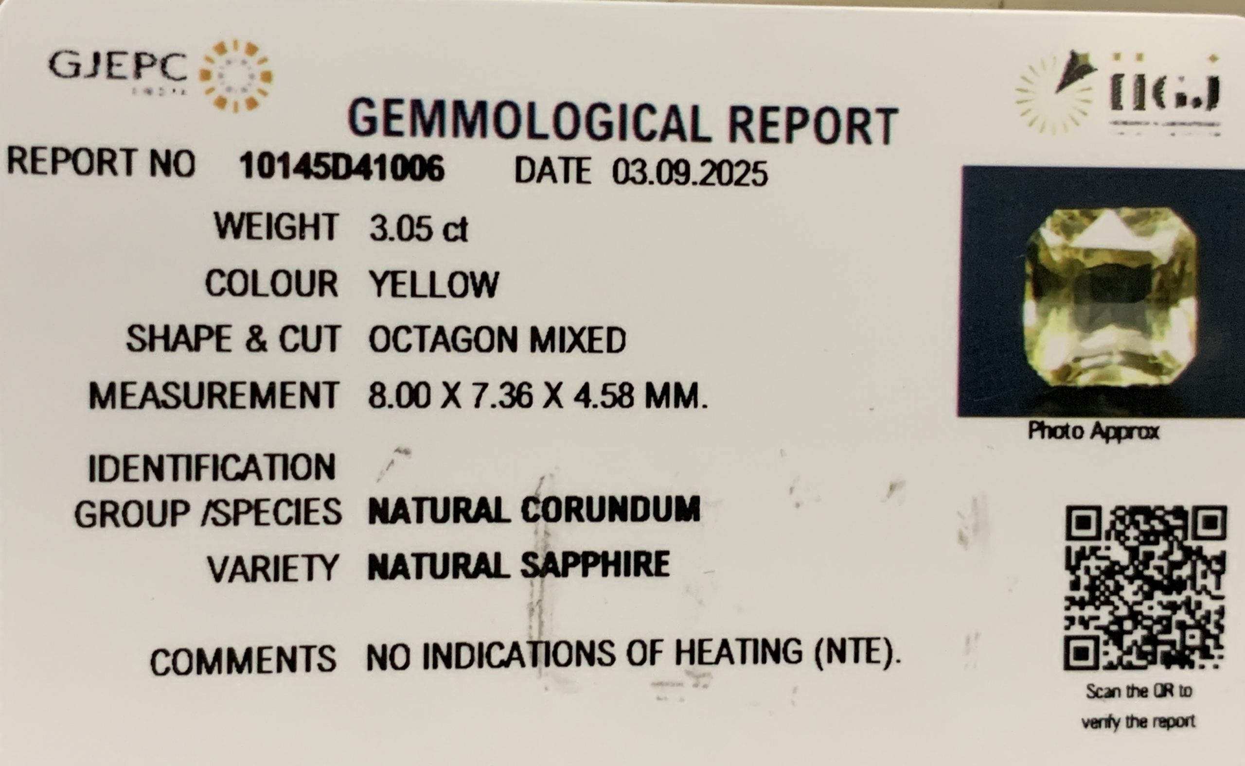 100% Natural, Non-Treated, Sri-Lankan Yellow Sapphire for potentiating the positive energies of planet Brihaspati (Jupiter) in one ’s life, Astrologically Approved (Jyotish- Standard), No- Negative inclusions (According to the Ancient Gems healing Vedic Texts), Purified and energized with Vedic Brihaspati (Jupiter) Mantras (To purify and magnify the planetary Energies).