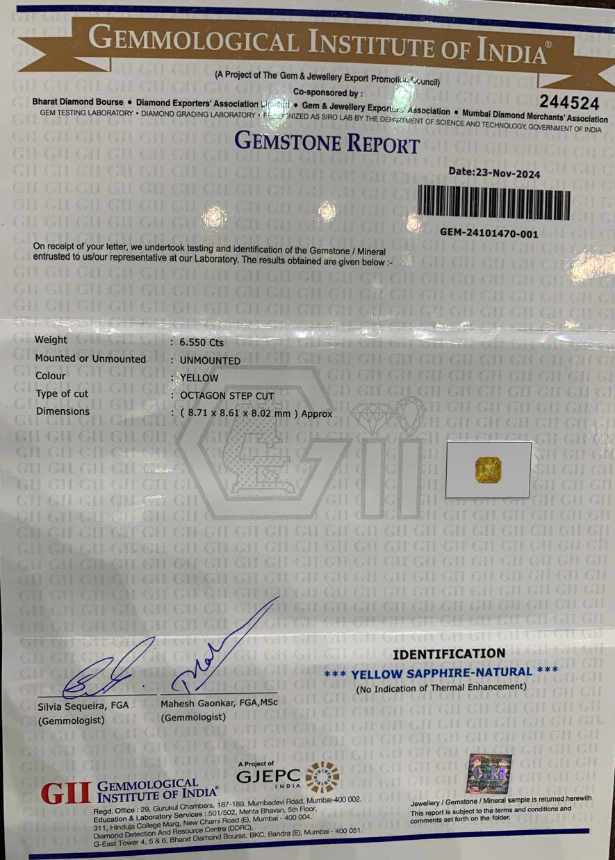 100% Natural, Non-Treated, Sri-Lankan Yellow Sapphire for potentiating the positive energies of planet Brihaspati (Jupiter) in one ’s life,  Astrologically Approved (Jyotish- Standard), No- Negative inclusions (According to the Ancient  Gems healing  Vedic Texts), Purified and energized with Vedic  Brihaspati (Jupiter) Mantras (To purify  and magnify the planetary Energies).