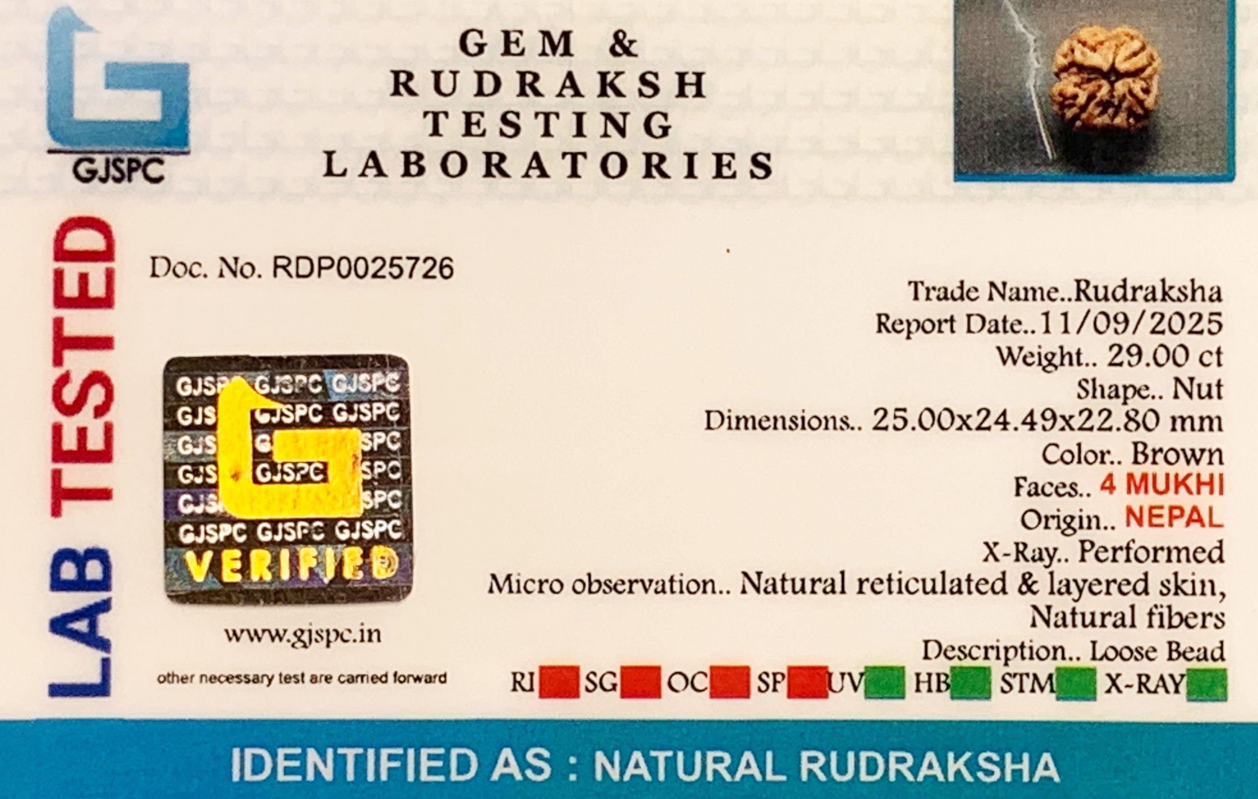 Four Faced Rudraksha is ruled by Mercury and cure diseases of ear, throat and nose, paralysis, sexual problems, gall bladder diseases, blood circulation, cough, brain related illness, asthma, stammering, memory lapse, respiratory tract problems, diseases affecting hands, arms, lungs and thyroid gland, etc.