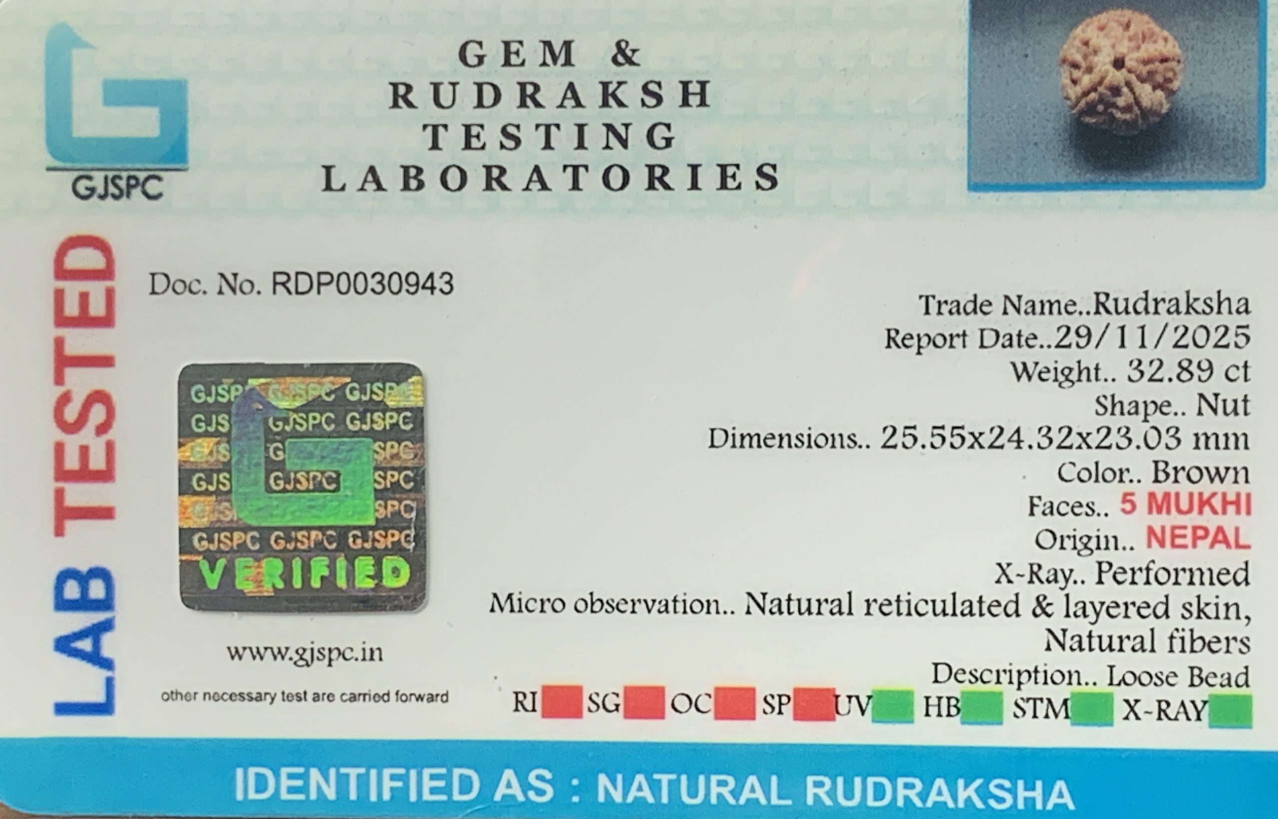 Five Faced Rudraksha is governed by Jupiter and cures diseases of liver, fistula, acidity,  blood pressure, breast ailments, problems of thighs, vertebral column and for memory, mental disability, heart problems, stress, anger management, diabetics, piles, neurotic and maladjustment problems.