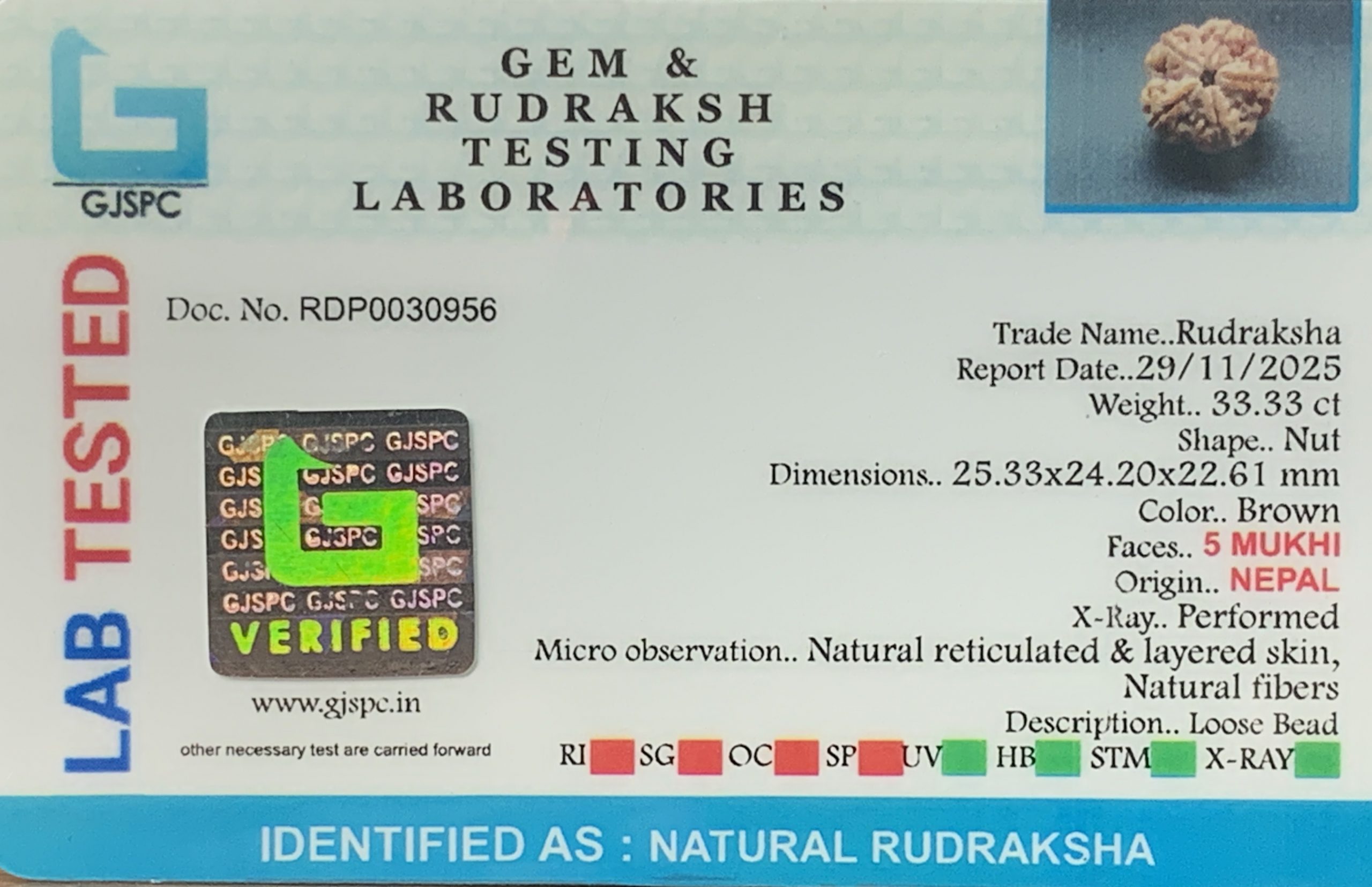 Five Faced Rudraksha is governed by Jupiter and cures diseases of liver, fistula, acidity,  blood pressure, breast ailments, problems of thighs, vertebral column and for memory, mental disability, heart problems, stress, anger management, diabetics, piles, neurotic and maladjustment problems.
