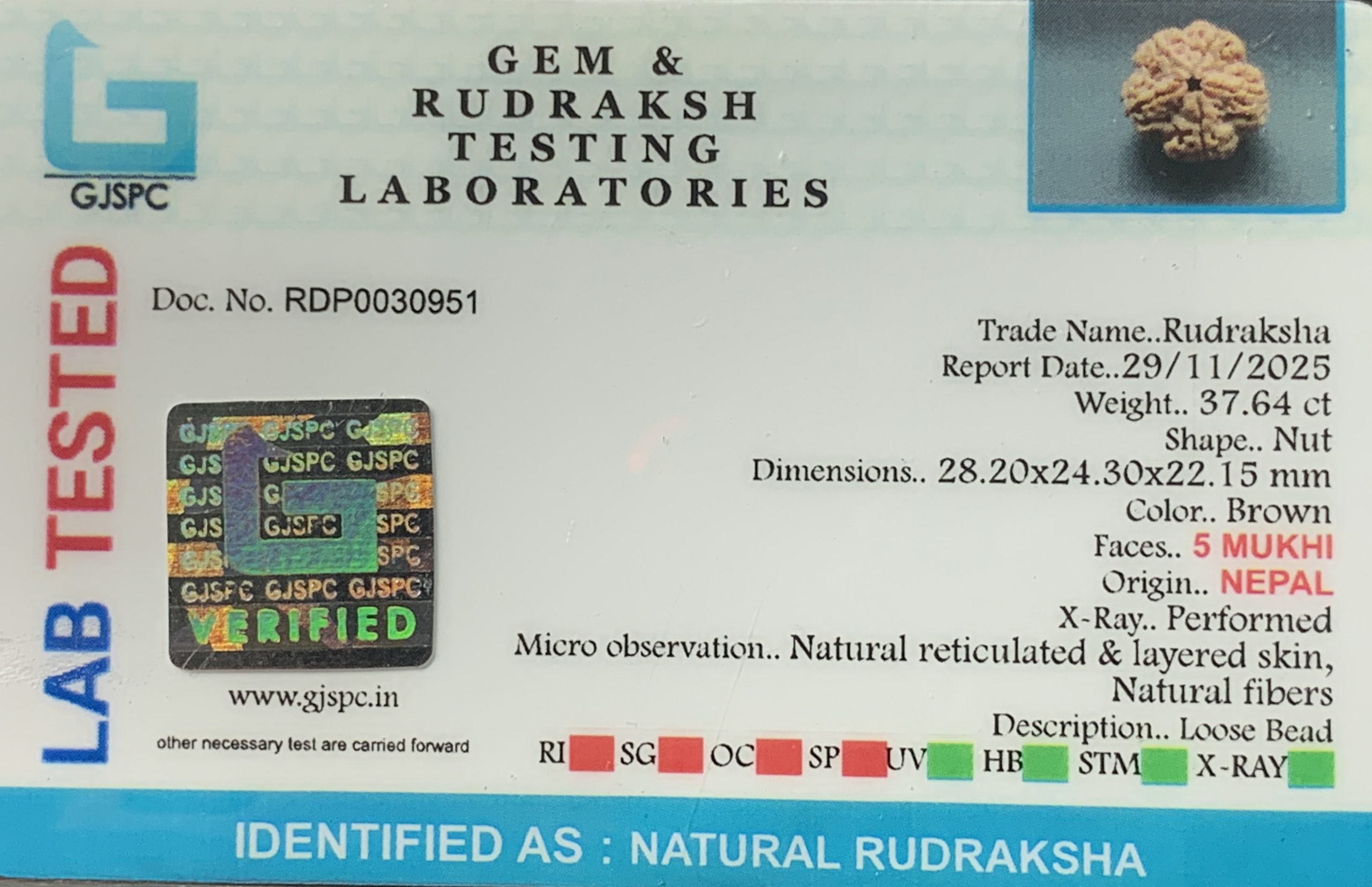 Five Faced Rudraksha is governed by Jupiter and cures diseases of liver, fistula, acidity,  blood pressure, breast ailments, problems of thighs, vertebral column and for memory, mental disability, heart problems, stress, anger management, diabetics, piles, neurotic and maladjustment problems.