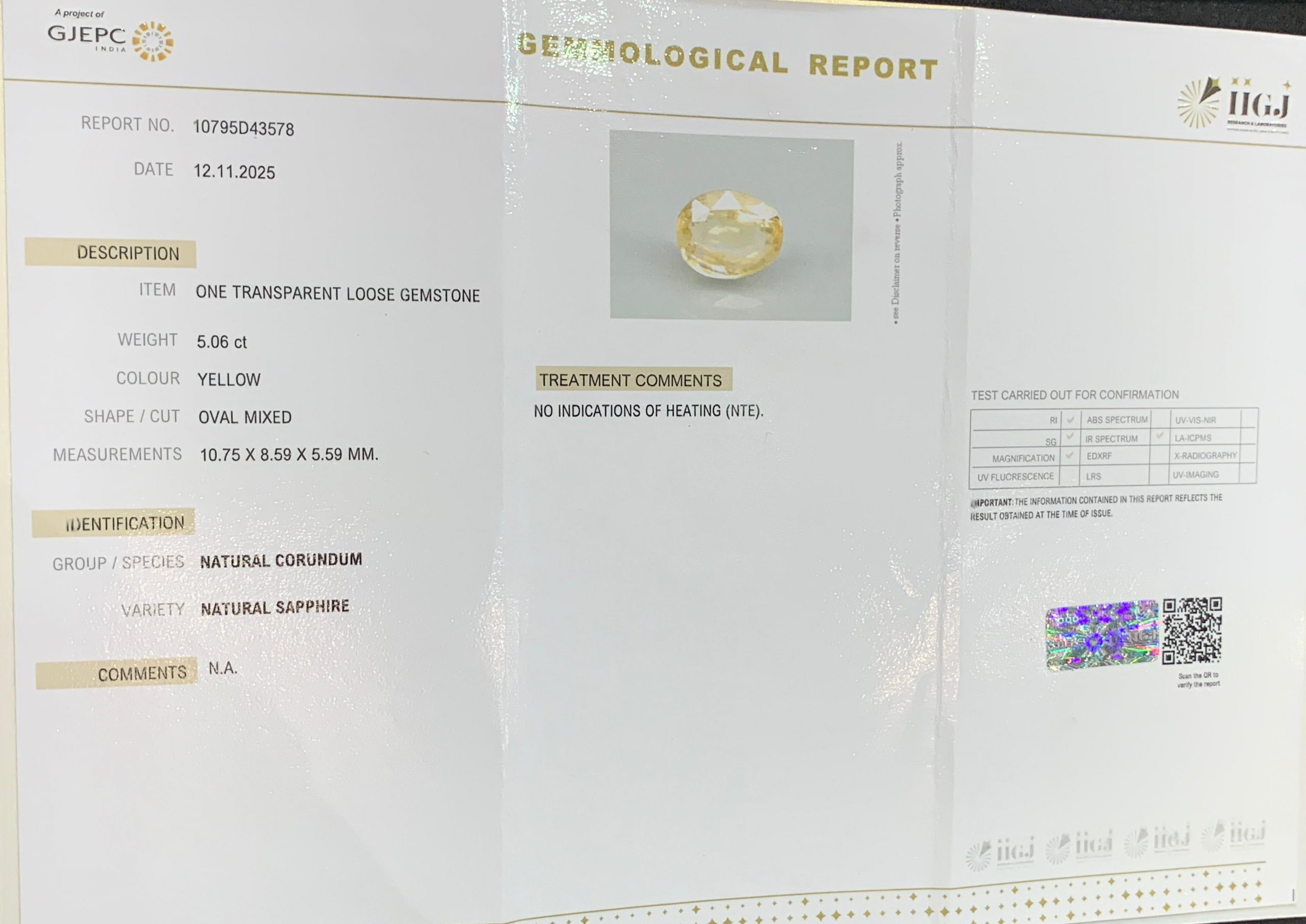 100% Natural, Non-Treated, Sri-Lankan Yellow sapphire for potentiating the positive energies of planet Brihaspati (Jupiter) in one ’s life , Astrologically Approved (Jyotish- Standard), No- Negative inclusions (According to the Ancient Gems healing Vedic Texts), Purified and energized with Vedic Brihaspati (Jupiter) Mantras (To purify and magnify the planetary Energies), Certified by Govt. Lab.