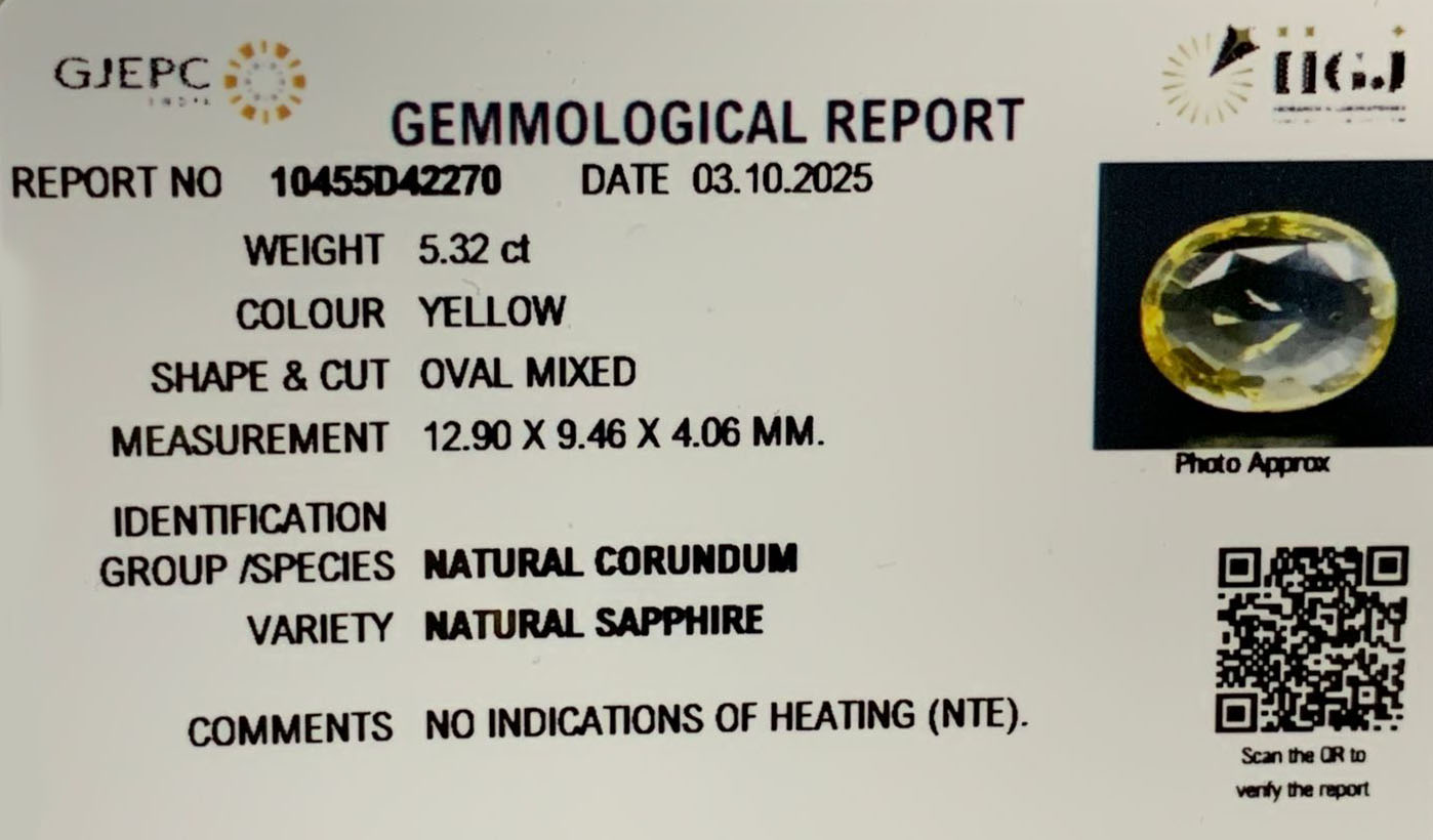 100% Natural, Non-Treated, Sri-Lankan Yellow sapphire for potentiating the positive energies of planet Brihaspati (Jupiter) in one ’s life , Astrologically Approved (Jyotish- Standard), No- Negative inclusions (According to the Ancient Gems healing Vedic Texts), Purified and energized with Vedic Brihaspati (Jupiter) Mantras (To purify and magnify the planetary Energies), Certified by Govt. Lab.